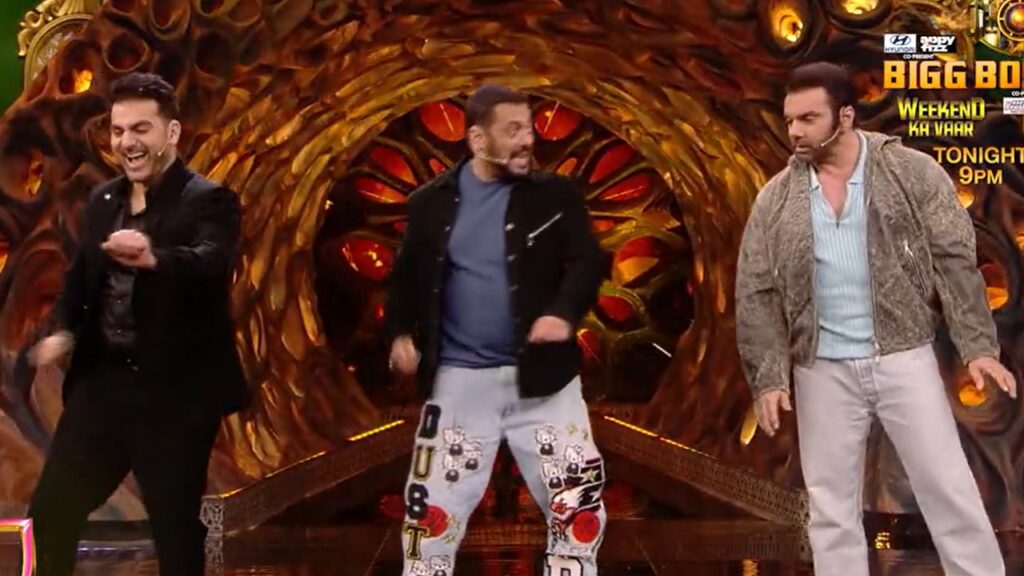 Salman Khan, the original host of the show, makes a grand entrance, addressing his brothers’ inquiry about his presence. He states, “You guys will host, I mean roast,” revealing that Arbaaz and Sohail will take charge of hosting duties every Sunday.