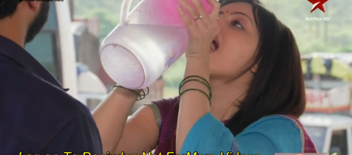 She says come, I will show you how to drink and puts water in her hands, asking him to drink water. Mann ke munder pe………………plays…………… He washes his face. She wipes his face by her saree cloth. Iss dil ka ab kya karun………………plays………….. She acts in her Nautanki style and he tickles her. They laugh. An old lady starts coughing. Astha gives her water. She asks are you travelling alone, is no one with you. The lady says no, I m travelling alone, please leave me till there. Astha helps her and the lady thanks her. The bus conductor gets in the bus and the bus leaves. Shlok shouts to him to stop, and asks Astha to come soon as bus is going. Astha comes and says bus is gone. He says why does this happen with us always.