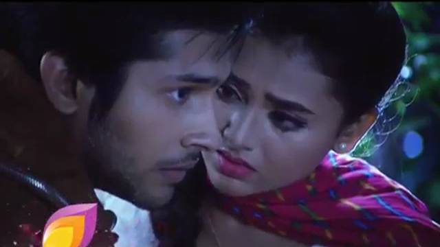 Ragini is trying to escape from clutches of Laksh but he has tightly wrapped his hands around her back and waist and his lips have tightly locked hers. He
