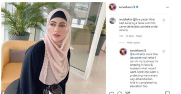 Former actor and model Sana Khan recently gave a befitting reply to a troll in front of her over four million Instagram followers. Rana shared a picture of hers where she was seen wearing a hijab. One of the users commented on her appearance in a recent post. He wrote, “Itna padai likhai kast karke kiya faida wohi toh sabke jaisa pardeke andar rahena (What’s the point of your education if you’re still going to wear a veil),” Sana responded with the utmost dignity and wrote “Mere bhai, jab parde mai rahke (If despite wearing a veil) I can do my business, have amazing in-laws and husband what more. I want. Most imp Allah is protecting me in every way. Alhamdulillah. And have completed my education too. So isn’t it a win win situation?”